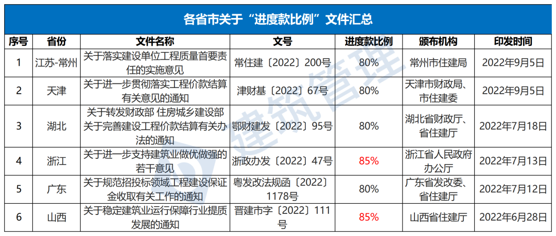 跟进发文的省份中,山西和浙江两省将进度款支付比例由80%提高至85%!浙江省人民政府办公厅发布《关于进一步支持建筑业做优做强的若干意见》,其中提出:- 将政府投资项目工程进度款支付比例由80%提高至85%。