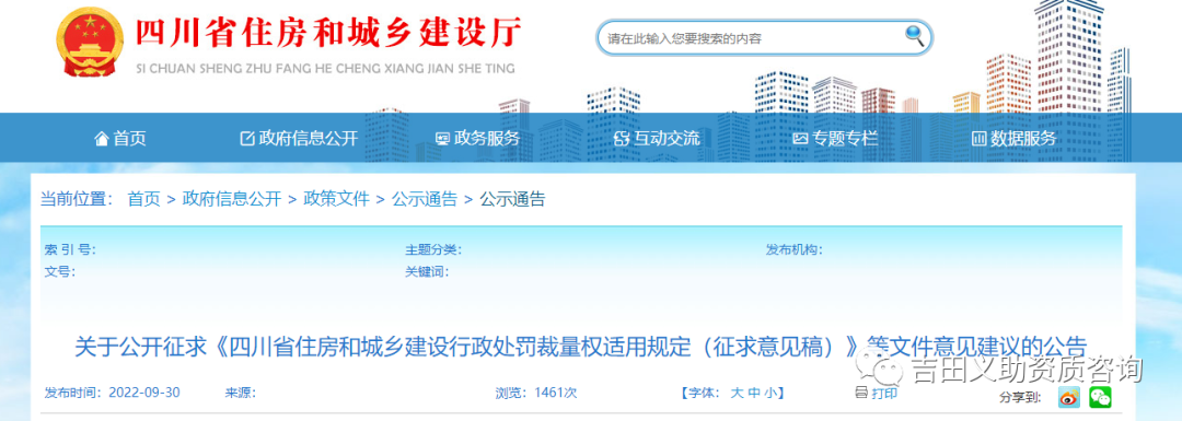 导读 ▎来源:四川住建厅 【部门规章】《住宅室内装饰装修管理办法》第二十二条 承接住宅室内装饰装修工程的装饰装修企业,必须经建设行政主管部门资质审查,取得相应的建筑业企业资质证书,并在其资质等级许可的范围内承揽工程。 以下为通知原文: ▼ 关于公开征求《四川省住房和城乡建设行政处罚裁量权适用规定(征求意见稿)》等文件意见建议的公告 四川省住房和城乡建设厅 2022年9月30日编辑搜图