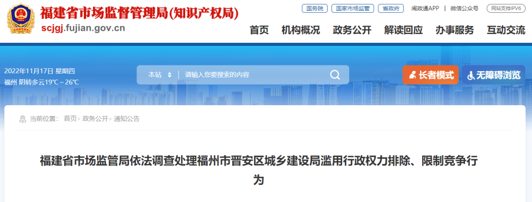 近期,福建省市场监督管理局发布一则《福建省市场监管局依法调查处理福州市晋安区城乡建设局滥用行政权力排除、限制竞争行为》的内容。